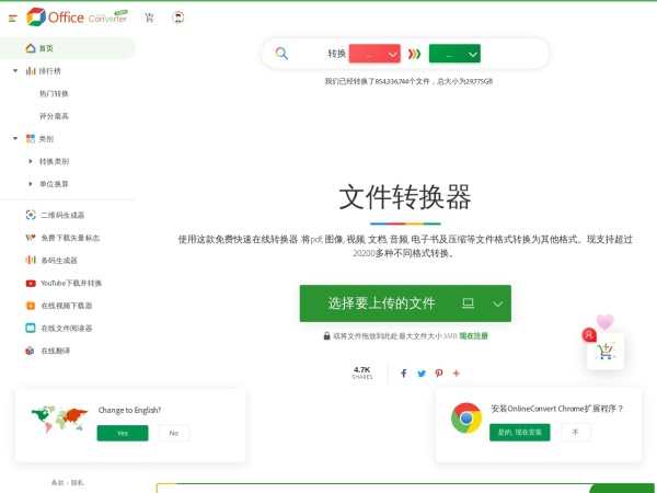 在线转换器(全称:在线转换器 - 转换视频, 音乐, 图像, PDF - Office-Converter.com)于2022年06月20日收录在本站在线工具分类目录,并成功建立了索引服务,供搜索引擎抓取/蜘蛛爬行/用户查找/检索服务;截至目前为止,本站已有 1609个网友浏览了在线转换器网站。