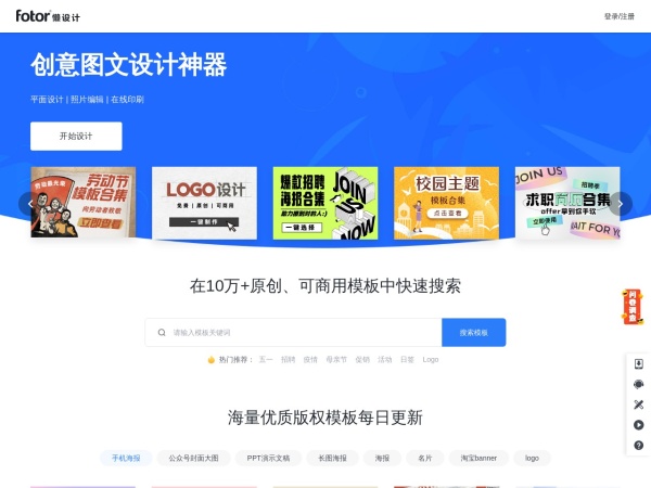 Canva在线设计(全称:Canva可画_在线设计协作平台_平面设计作图软件_视觉办公套件 - Canva中文官网)于2025年02月18日收录在本站设计素材分类目录,并成功建立了索引服务,供搜索引擎抓取/蜘蛛爬行/用户查找/检索服务;截至目前为止,本站已有 472个网友浏览了Canva在线设计网站。