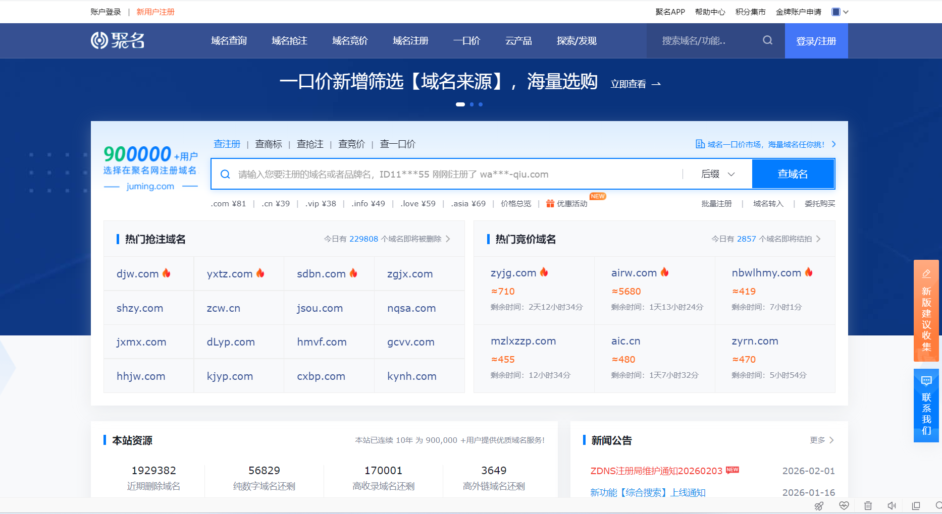 聚名网(全称:聚名网-到期域名查询抢注-域名注册-老域名买卖交易平台)于2026年02月01日收录在本站网络服务分类目录,并成功建立了索引服务,供搜索引擎抓取/蜘蛛爬行/用户查找/检索服务;截至目前为止,本站已有 62个网友浏览了聚名网网站。