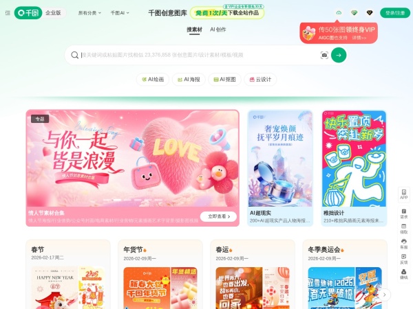 千图网(全称:千图网)于2026年02月10日收录在本站设计素材分类目录,并成功建立了索引服务,供搜索引擎抓取/蜘蛛爬行/用户查找/检索服务;截至目前为止,本站已有 42个网友浏览了千图网网站。