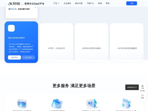 讯飞听见(全称:讯飞听见-免费在线录音转文字-语音转文字-录音整理-语音翻译软件企业 )于2026年02月12日收录在本站AI办公分类目录,并成功建立了索引服务,供搜索引擎抓取/蜘蛛爬行/用户查找/检索服务;截至目前为止,本站已有 32个网友浏览了讯飞听见网站。