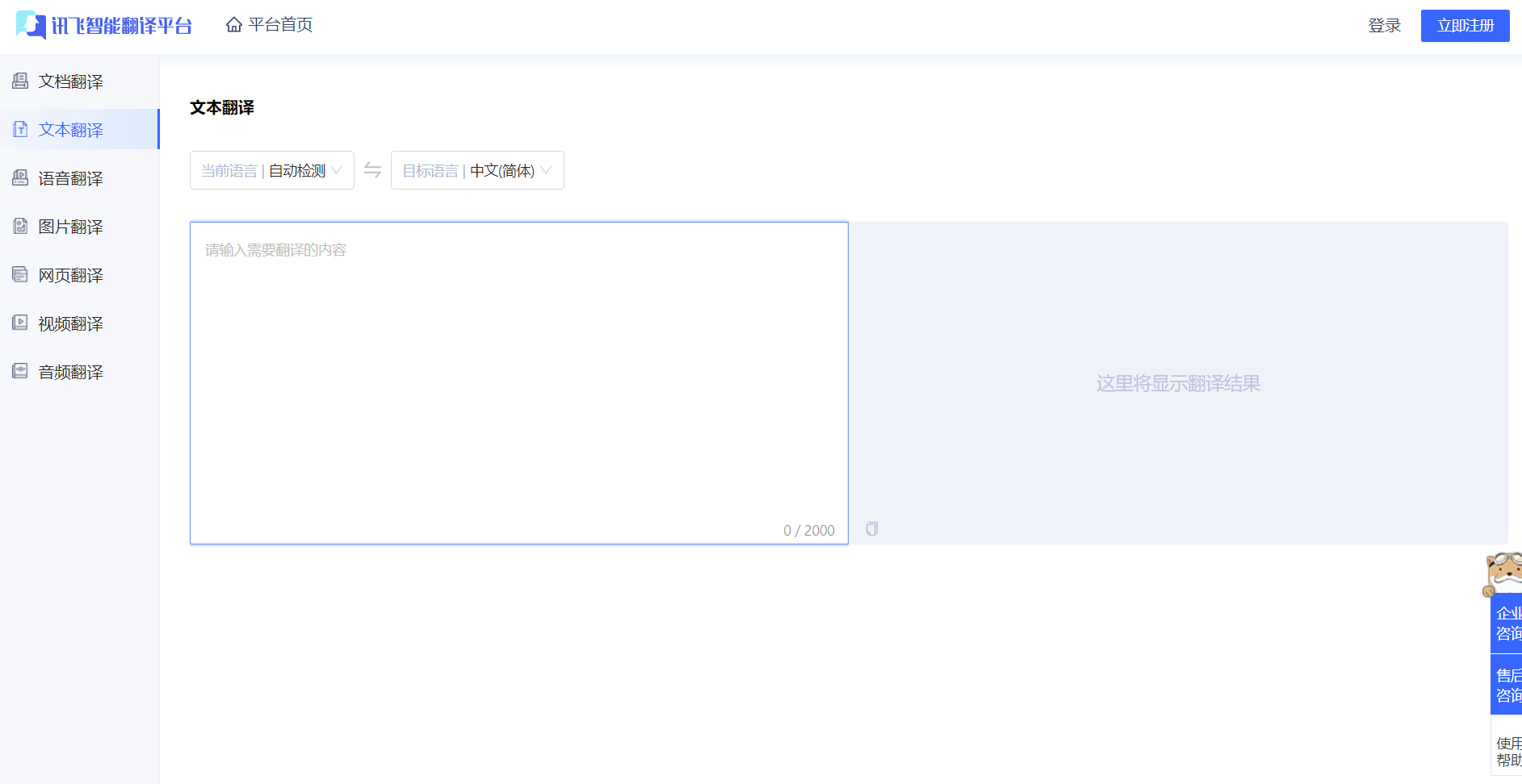 讯飞智能翻译平台是专业的在线文档翻译平台,提供PDF/Word/Excel/PPT文件翻译、图片识别翻译、在线翻译等服务,支持22种文档格式以及60多种语种和中文互译,译文结果高度还原原文样式排版。涵盖期刊论文、法律、金融、计算机、能源、体育、医疗等多个领域翻译,翻译更精准。