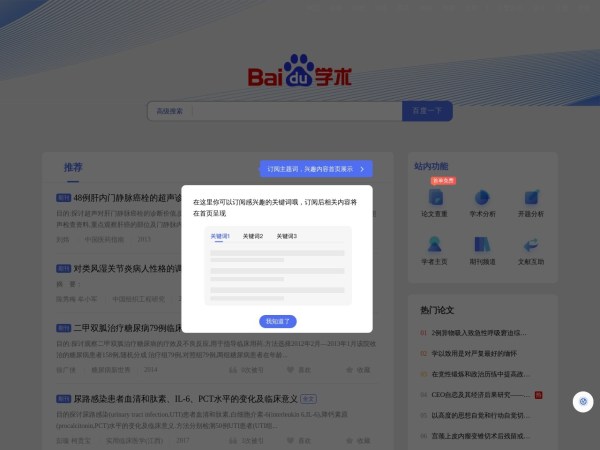 百度学术搜索,是一个提供海量中英文文献检索的学术资源搜索平台,涵盖了各类学术期刊、学位、会议论文,旨在为国内外学者提供最好的科研体验。