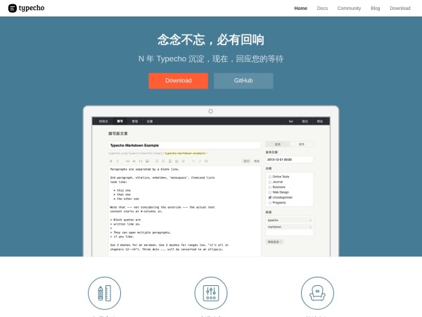 Typecho是一个支持Markdown排版语法,原生支持云主机,拥有插件与模板机制的博客平台。Typecho已有500,000用户选择,提供官方网站,文档,社区,下载等服务