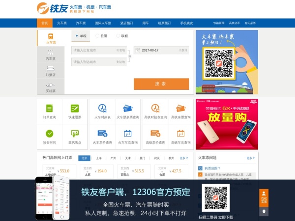 铁友网为您提供2015年最新全国所有列车火车票查询,火车票网上订票,火车时刻表,火车票余票,火车票价,以及高铁等订购网站12306信息查询及预订服务,让您的旅途更加愉快!