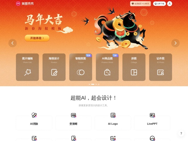 美图秀秀网页版在线图片照片编辑制作美化修改处理工具提供在线拼图,在线改图修图,在线P图,在线美颜,在线ps照片,另外还提供图片美化、人像美容、添加文字、批量处理图片大小、证件照换底色、图片压缩等好用的功能,还有海报设计、平面设计、广告设计、贴纸素材、边框等丰富的内容,可制作PPT图片、简历、GIF动图等,支持Windows、Mac、Linux及网页版。