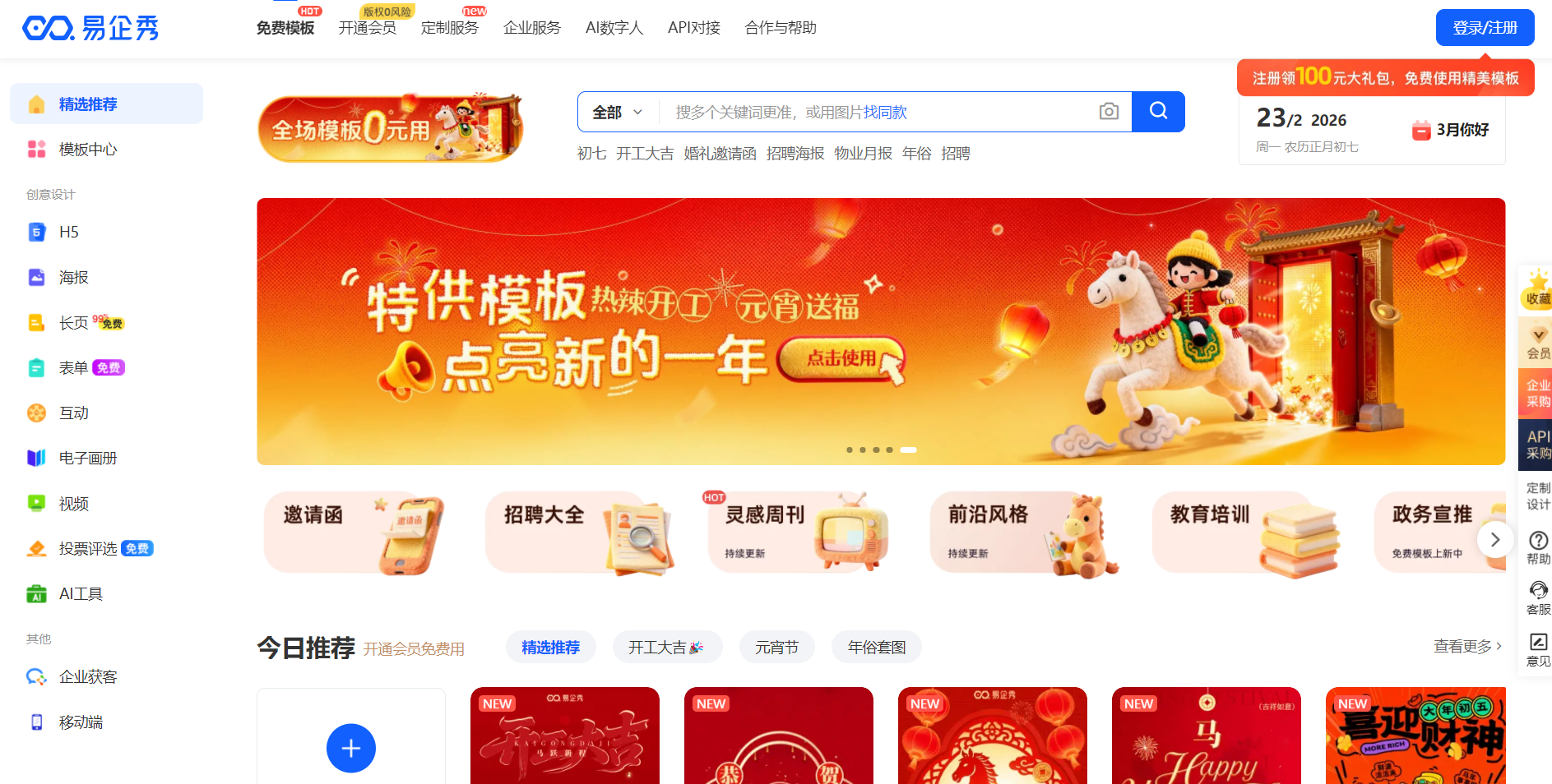 易企秀提供免费H5微场景、海报、长图、表单、视频、互动游戏、画册、数字人、建站、小程序等制作工具及企业微信私域数字智能营销平台,助力企业高效完成内容创意、传播获客、数据管理、效果转化的自营销闭环