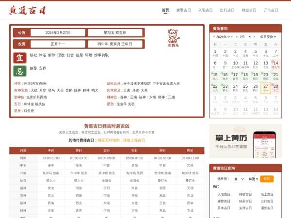 黄道吉日网站提供黄历每日吉凶宜忌查询、农历查询、黄道吉日查询、时辰凶吉查询,提供免费搬家吉日查询、入宅吉日查询、结婚吉日查询、开业吉日查询等内容。