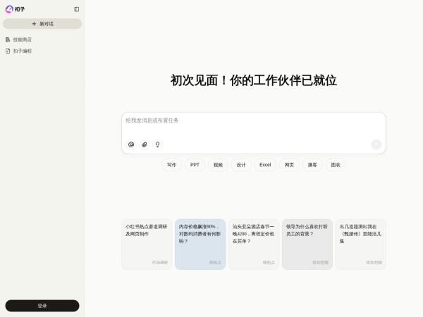 扣子是强大的AI办公助手,基于Agent技术,集成了AI写作、AI PPT生成、AI表格处理、AI设计、AI播客、AI生图与AI视频等全功能。扣子助力财经分析、市场营销等多场景办公任务自动化,全面提升工作效率。
