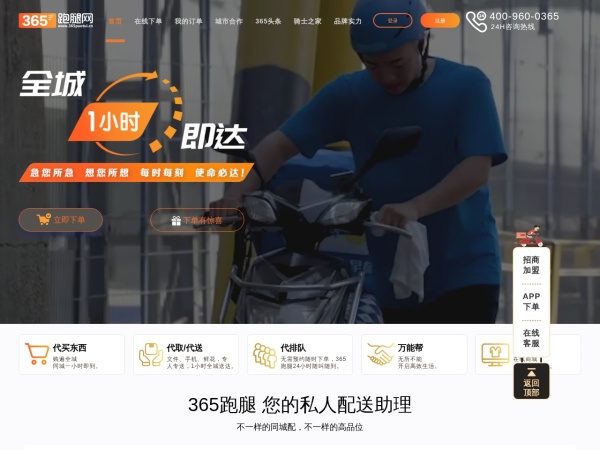 365跑腿平均1分钟上门,1小时送达全城的同城快递及跑腿服务。同城代买代取代送代排队就找365跑腿服务公司,24小时提供安全、高效、便捷的高端专人专送服务!365跑腿APP下载,同城1小时速达