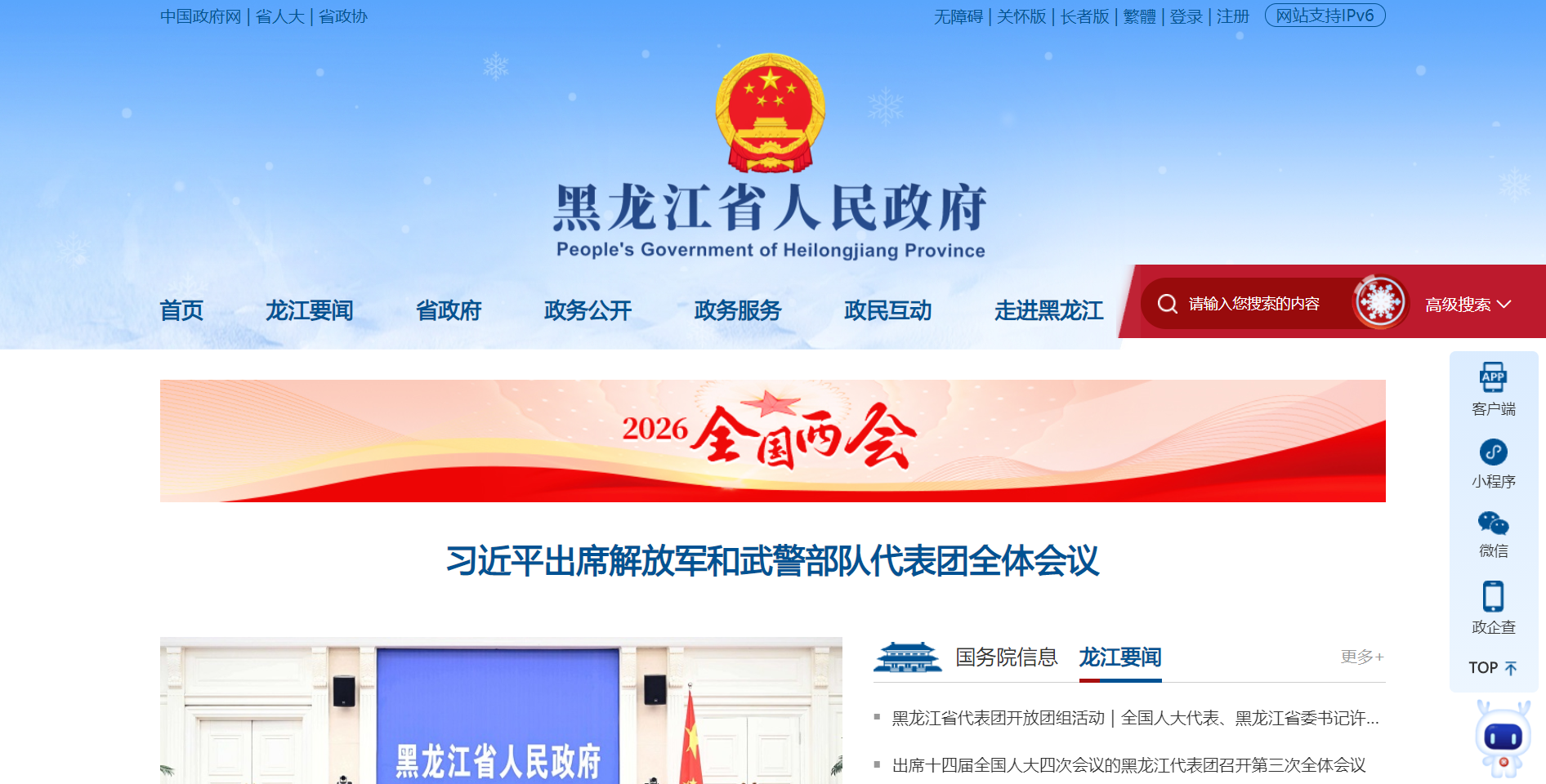 黑龙江省人民政府网是全省电子政务建设的重要组成部分,是全省政府信息发布的第一平台。由黑龙江省政府主办、省政府办公厅承办、人民网黑龙江频道运营维护,省直各单位及地市政府提供有关内容保障
