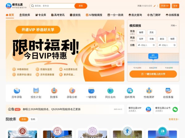 报志愿,选大学,择专业,提高学生录取率!蝶变志愿通过大数据技术,搜集全国各高校及省市教育资讯,整合专业职业信息,高效准确测评,人工智能进行风险评估,实时监测报考热度,模拟投档过程,将志愿填报规范化,简单化。